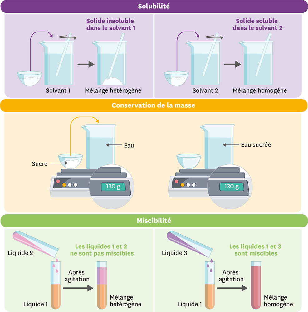 Lors d’une dissolution, il y a conservation de la masse : la masse d’une solution est égale à la somme des masses du soluté et du solvant.