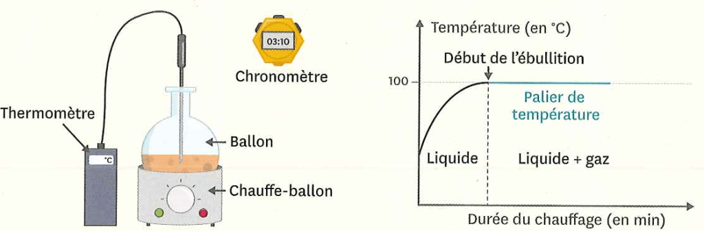 La température d’un corps pur liquide que l’on chauffe augmente jusqu’à une valeur appelée « palier de température » à laquelle elle se stabilise. C’est le moment du changement d’état de l’état liquide à l’état vapeur : des bulles de vapeur se forment au sein du liquide. Cette vaporisation s’appelle une ébullition.