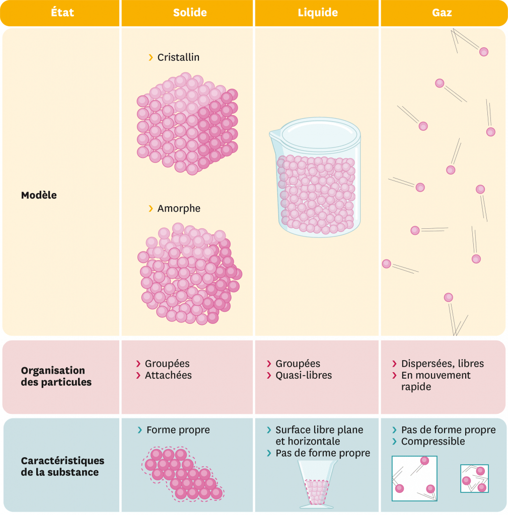 Le modèle particulaire permet de comprendre les caractéristiques des états de la matière. À l’état solide, chaque particule vibre en restant liée aux mêmes particules voisines : les solides ont une forme propre. À l’état liquide, les particules sont groupées mais se déplacent librement : les liquides n’ont pas de forme propre. À l’état gazeux, les particules se déplacent dans le vide à grande vitesse, de manière désordonnée : les gaz n’ont pas de forme propre.