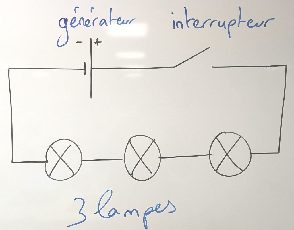 il faut : 1 générateur – 3 lampes – 5 fils – 1 interrupteur