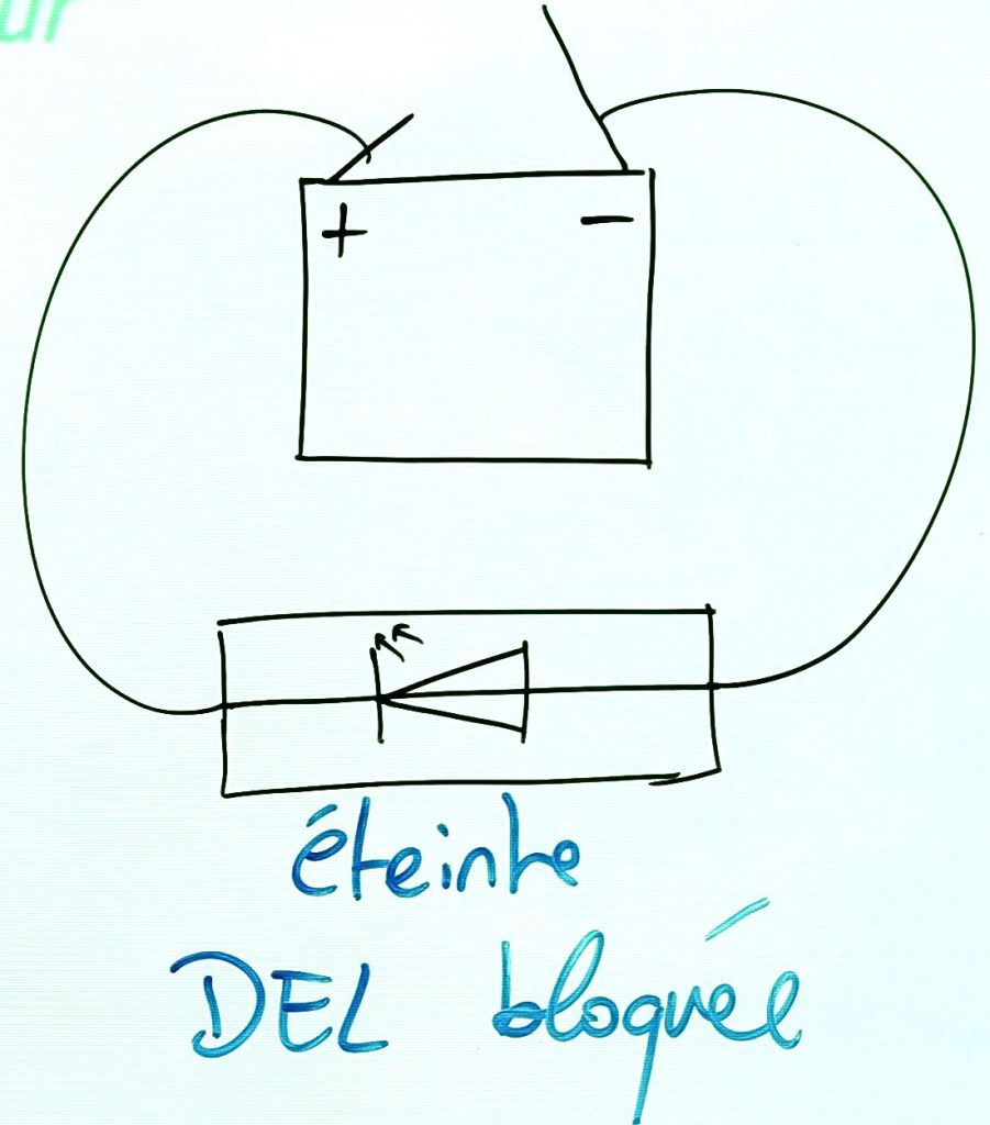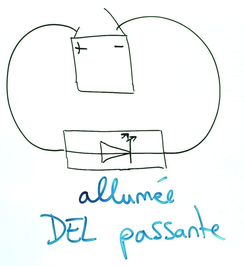 consigne (ne pas recopier) : circuit DEL allumée et circuit DEL éteinte, dessiner les circuits, annoter les dessins