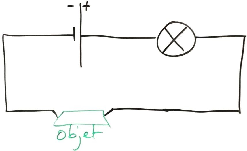 schéma du circuit avec pile, lampe et objet à tester