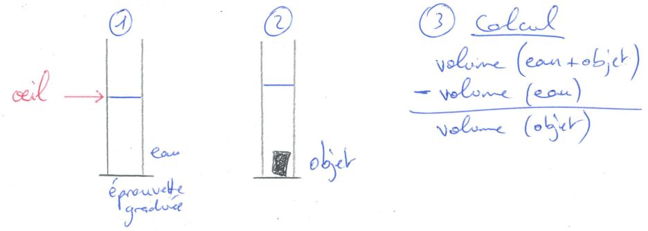étape 3 : calcul : volume (eau+objet) – volume (eau) = volume (objet) =